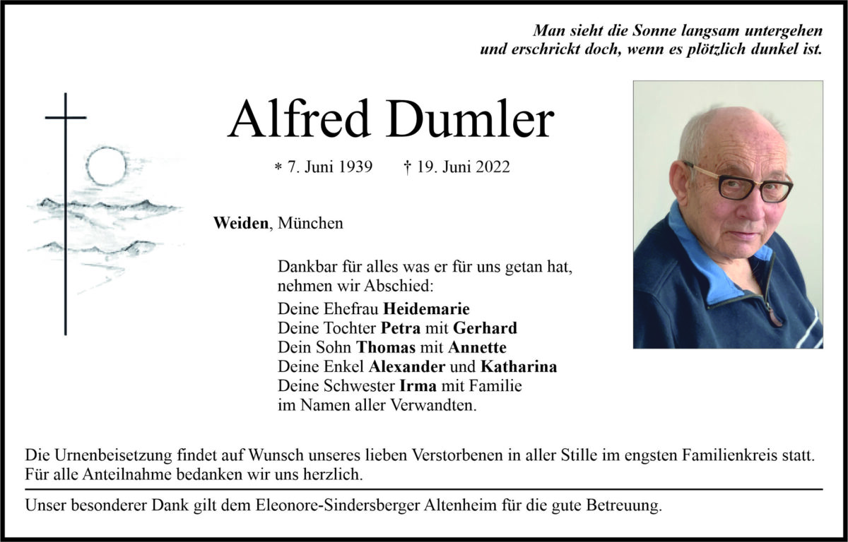 Traueranzeige Alfred Dumler, Weiden 25. Juni 2022, 06:00 Uhr Von: redaktion Traueranzeige Alfred Dumler, Weiden Stadtgebiete Weiden Weiden Stadt
