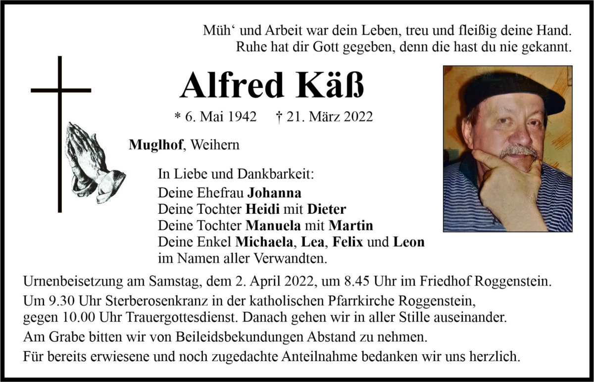 Traueranzeige Alfred Käß, Muglhof 30. März 2022, 06:00 Uhr Von: redaktion Traueranzeige Alfred Käß, Muglhof Stadtgebiete Weiden Weiden Stadt