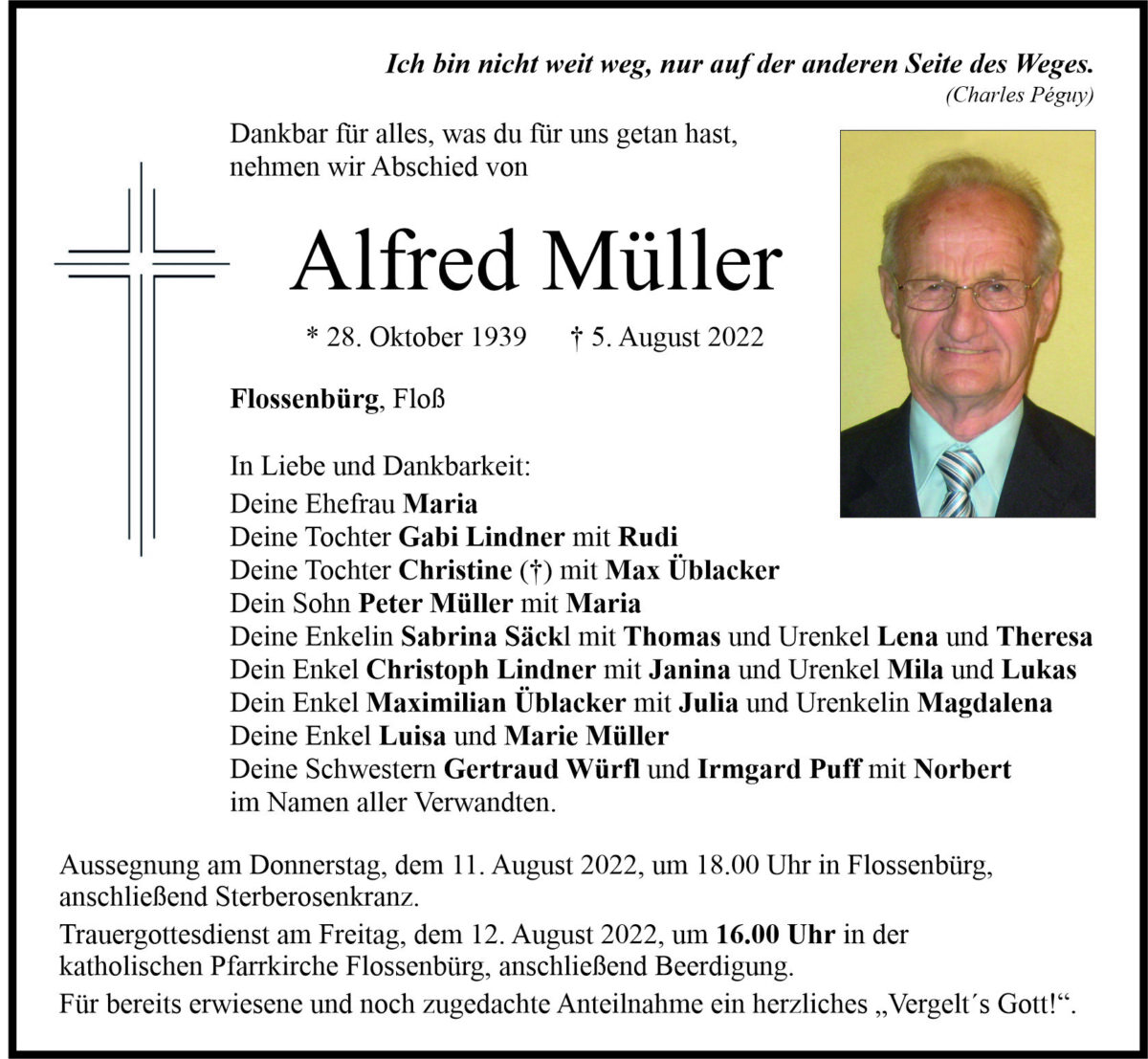 Traueranzeige Alfred Müller, Flossenbürg 10. August 2022, 06:00 Uhr Von: redaktion Traueranzeige Alfred Müller, Flossenbürg Landkreis Neustadt/WN Floß Flossenbürg