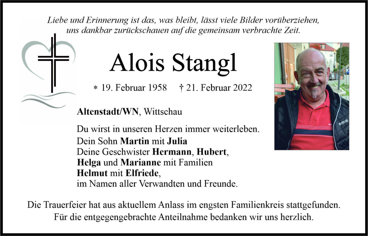 Traueranzeige Alois Stangl, Altenstadt/WN 02. März 2022, 06:00 Uhr Von: redaktion Traueranzeige Alois Stangl, Altenstadt/WN Landkreis Neustadt/WN Altenstadt/WN