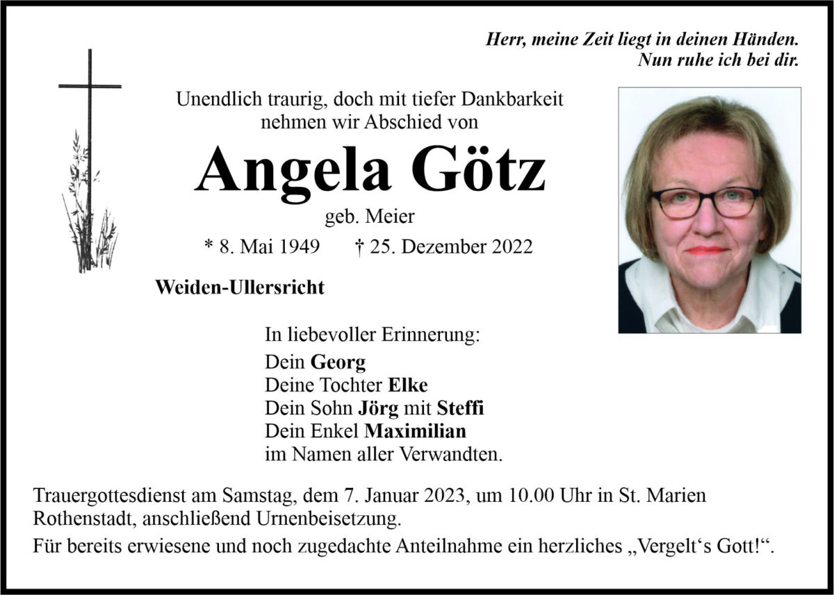 Traueranzeige Angela Götz, Weiden-Ullersricht 05. Januar 2023, 06:00 Uhr Von: redaktion Traueranzeige Angela Götz, Weiden-Ullersricht Stadtgebiete Weiden Weiden Stadt