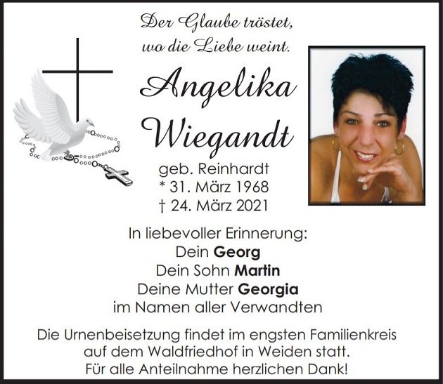 Traueranzeige Angelika Wiegandt, Weiden 27. März 2021, 06:59 Uhr Von: redaktion Traueranzeige Angelika Wiegandt, Weiden Stadtgebiete Weiden Weiden Stadt