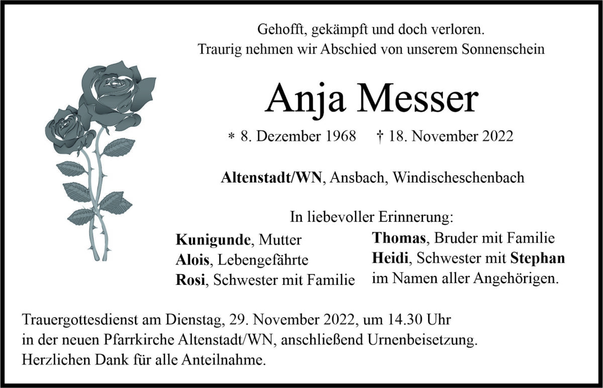 Traueranzeige Anja Messer, Altenstadt/WN 26. November 2022, 06:00 Uhr Von: redaktion Traueranzeige Anja Messer, Altenstadt/WN Landkreis Neustadt/WN Altenstadt/WN Windischeschenbach