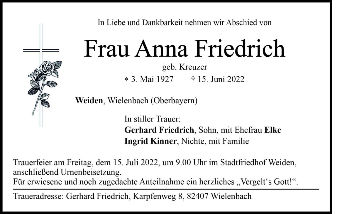 Traueranzeige Anna Friedrich Weiden 11. Juli 2022, 06:00 Uhr Von: redaktion Traueranzeige Anna Friedrich Weiden Stadtgebiete Weiden Weiden Stadt
