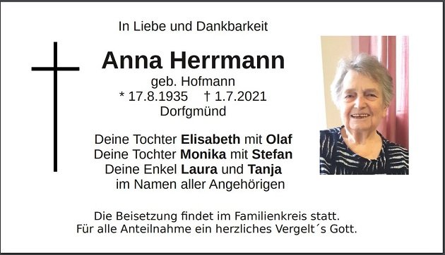 Traueranzeige Anna Herrmann, Dorfgmünd 10. Juli 2021, 04:00 Uhr Von: redaktion Traueranzeige Anna Herrmann, Dorfgmünd Landkreis Neustadt/WN Grafenwöhr