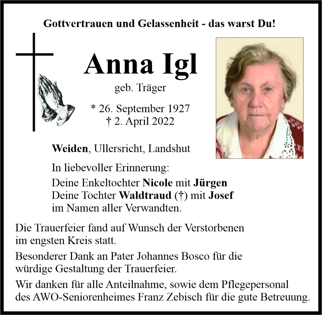 Traueranzeige Anna Igl, Weiden 13. April 2022, 06:00 Uhr Von: redaktion Traueranzeige Anna Igl, Weiden Stadtgebiete Weiden Weiden Stadt