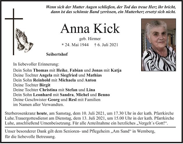 Traueranzeige Anna Kick, Seibertshof 10. Juli 2021, 04:00 Uhr Von: redaktion Traueranzeige Anna Kick, Seibertshof