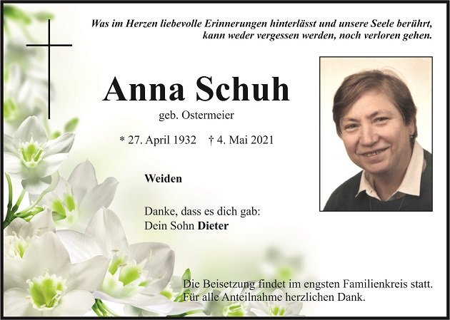 Traueranzeige Anna Schuh, Weiden 08. Mai 2021, 04:00 Uhr Von: redaktion Traueranzeige Anna Schuh, Weiden Stadtgebiete Weiden Weiden Stadt