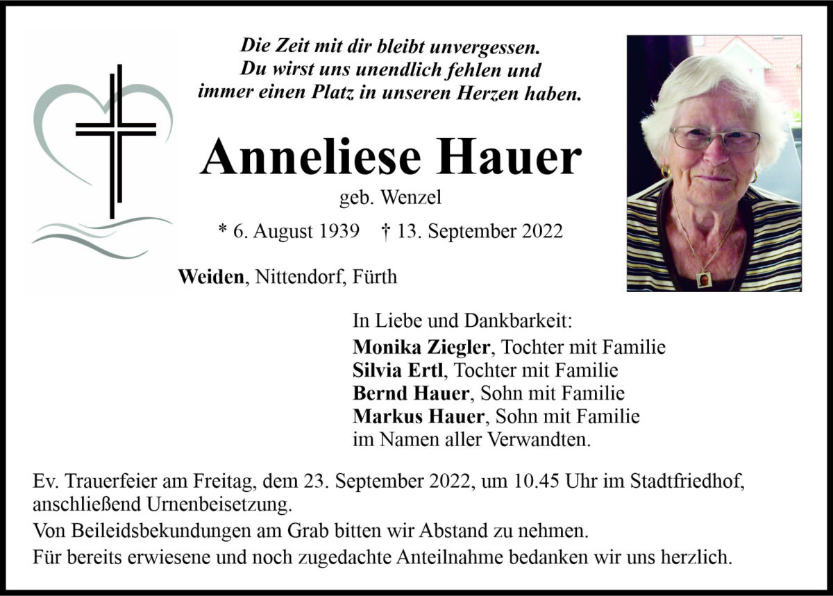 Traueranzeige Anneliese Hauer, Weiden 20. September 2022, 06:00 Uhr Von: redaktion Traueranzeige Anneliese Hauer, Weiden Stadtgebiete Weiden Weiden Stadt