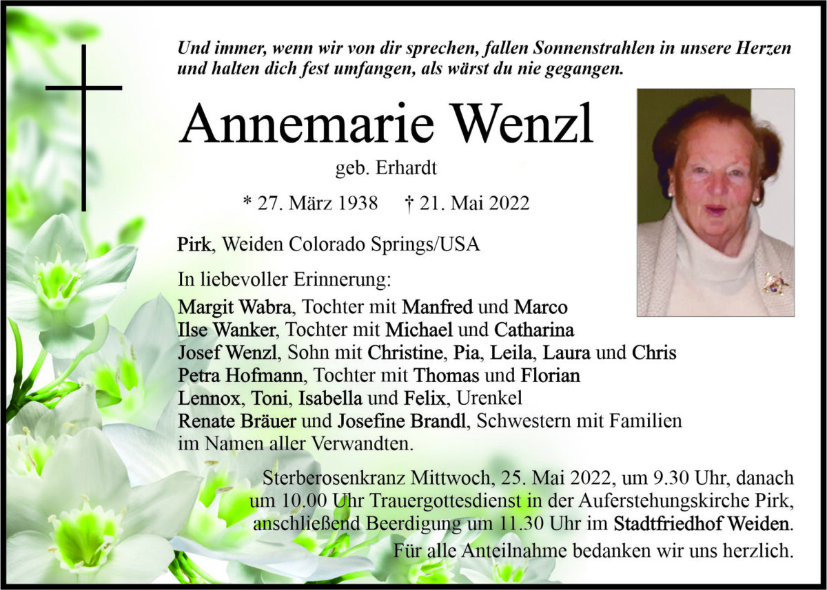 Traueranzeige Annemarie Wenzl, Pirk 24. Mai 2022, 06:00 Uhr Von: redaktion Traueranzeige Annemarie Wenzl, Pirk Landkreis Neustadt/WN Pirk Stadtgebiete Weiden Weiden Stadt