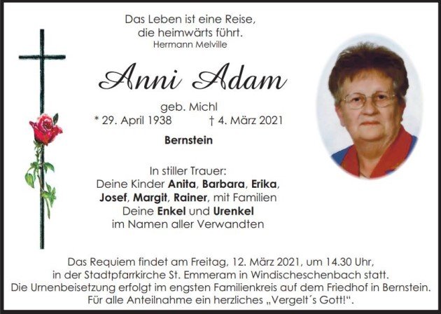 Traueranzeige Anni Adam, Bernstein 10. März 2021, 06:30 Uhr Von: redaktion Traueranzeige Anni Adam, Bernstein