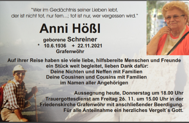 Traueranzeige Anni Hößl, Grafenwöhr 25. November 2021, 06:00 Uhr Von: redaktion Traueranzeige Anni Hößl, Grafenwöhr Landkreis Neustadt/WN Grafenwöhr