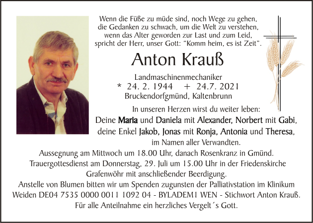 Traueranzeige Anton Krauß, Grafenwöhr 27. Juli 2021, 04:00 Uhr Von: redaktion Traueranzeige Anton Krauß, Grafenwöhr Landkreis Neustadt/WN Grafenwöhr