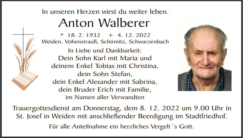 Traueranzeige Anton Walberer, Weiden 06. Dezember 2022, 06:00 Uhr Von: redaktion Traueranzeige Anton Walberer, Weiden Landkreis Neustadt/WN Schirmitz Schwarzenbach Vohenstrauß Stadtgebiete Weiden Weiden Stadt