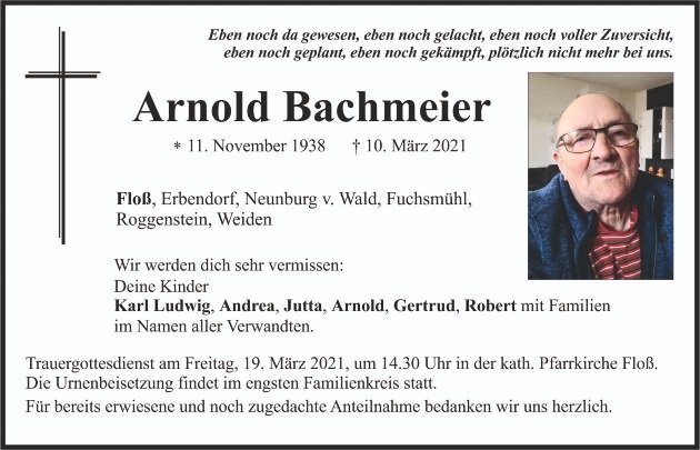 Traueranzeige Arnold Bachmeier, Floß 16. März 2021, 06:10 Uhr Von: redaktion Traueranzeige Arnold Bachmeier, Floß Landkreis Tirschenreuth Erbendorf Fuchsmühl Landkreis Neustadt/WN Floß Stadtgebiete Weiden Weiden Stadt