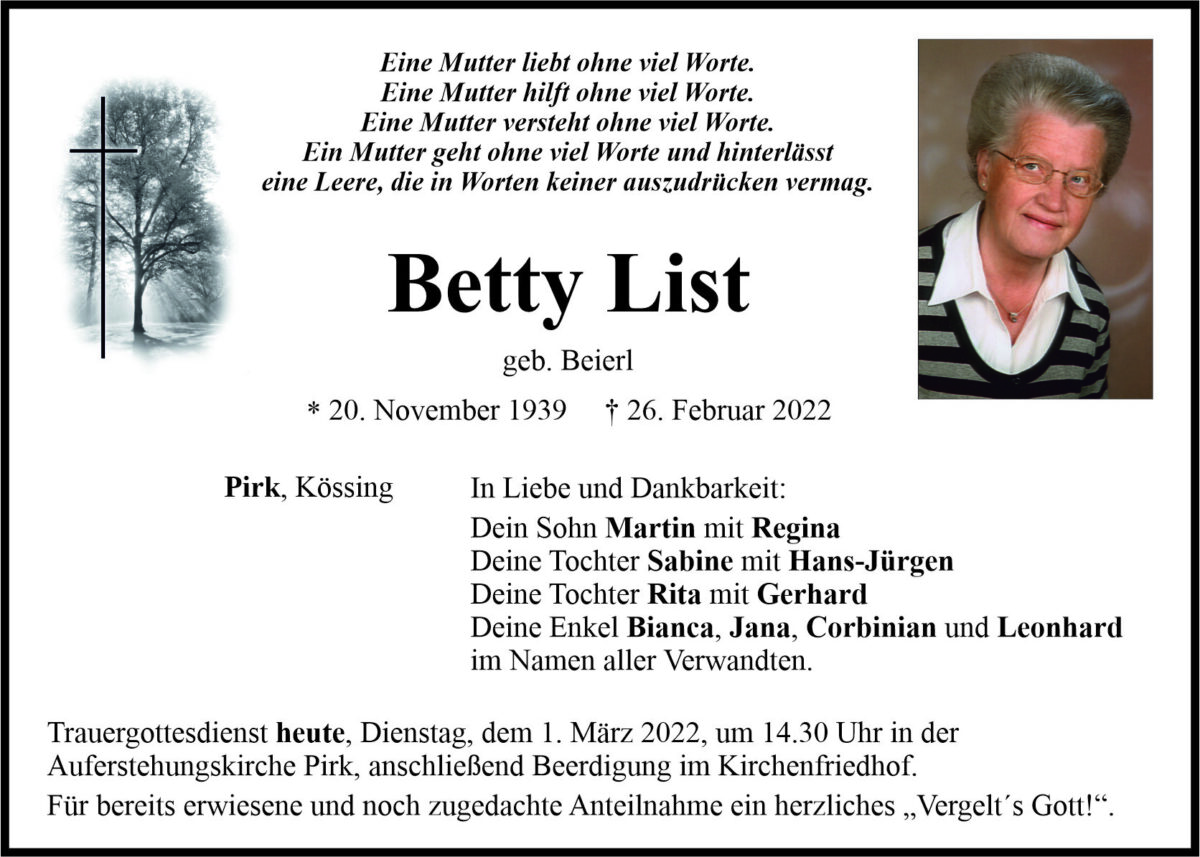 Traueranzeige Betty List, Pirk 01. März 2022, 06:00 Uhr Von: redaktion Traueranzeige Betty List, Pirk Landkreis Neustadt/WN Pirk