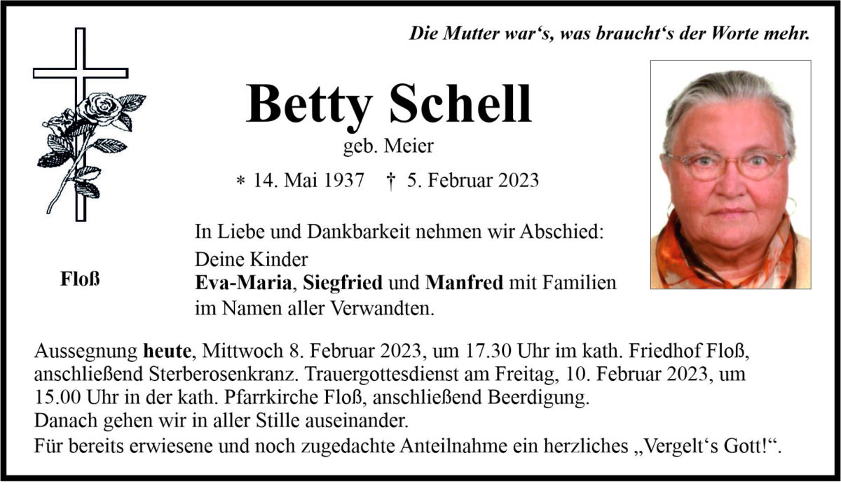 Traueranzeige Betty Schell, Floß 08. Februar 2023, 06:00 Uhr Von: redaktion Traueranzeige Betty Schell, Floß Landkreis Neustadt/WN Floß