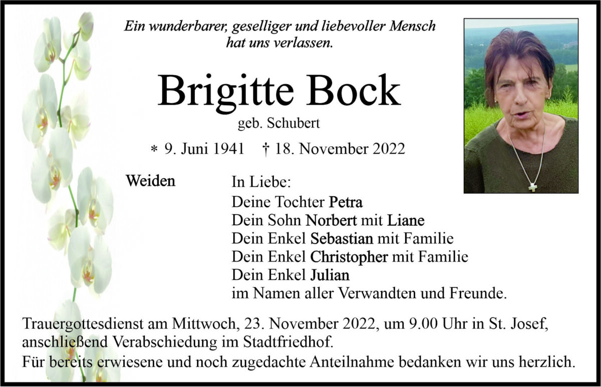 Traueranzeige Brigitte Bock, Weiden 22. November 2022, 06:00 Uhr Von: redaktion Traueranzeige Brigitte Bock, Weiden Stadtgebiete Weiden Weiden Stadt