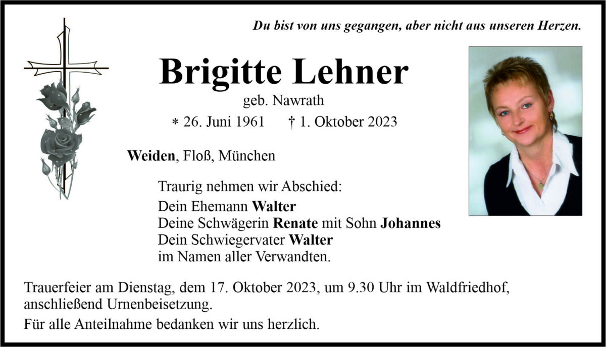 Traueranzeige Brigitte Lehner, Weiden 13. Oktober 2023, 20:00 Uhr Von: redaktion Traueranzeige Brigitte Lehner, Weiden Landkreis Neustadt/WN Floß Stadtgebiete Weiden Weiden Stadt
