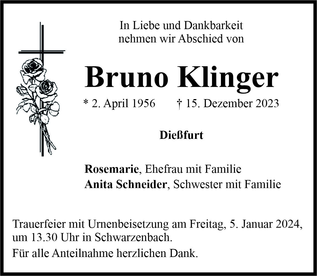 Traueranzeige Bruno Klinger, Dießfurt 29. Dezember 2023, 20:00 Uhr Von: redaktion Traueranzeige Bruno Klinger, Dießfurt Landkreis Neustadt/WN Dießfurt Schwarzenbach
