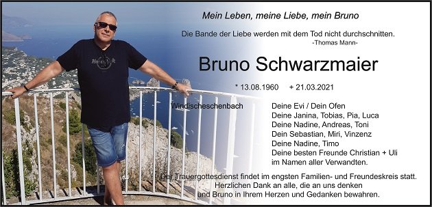 Traueranzeige Bruno Schwarzmaier, Windischeschenbach 27. März 2021, 06:31 Uhr Von: redaktion Traueranzeige Bruno Schwarzmaier, Windischeschenbach Landkreis Neustadt/WN Windischeschenbach