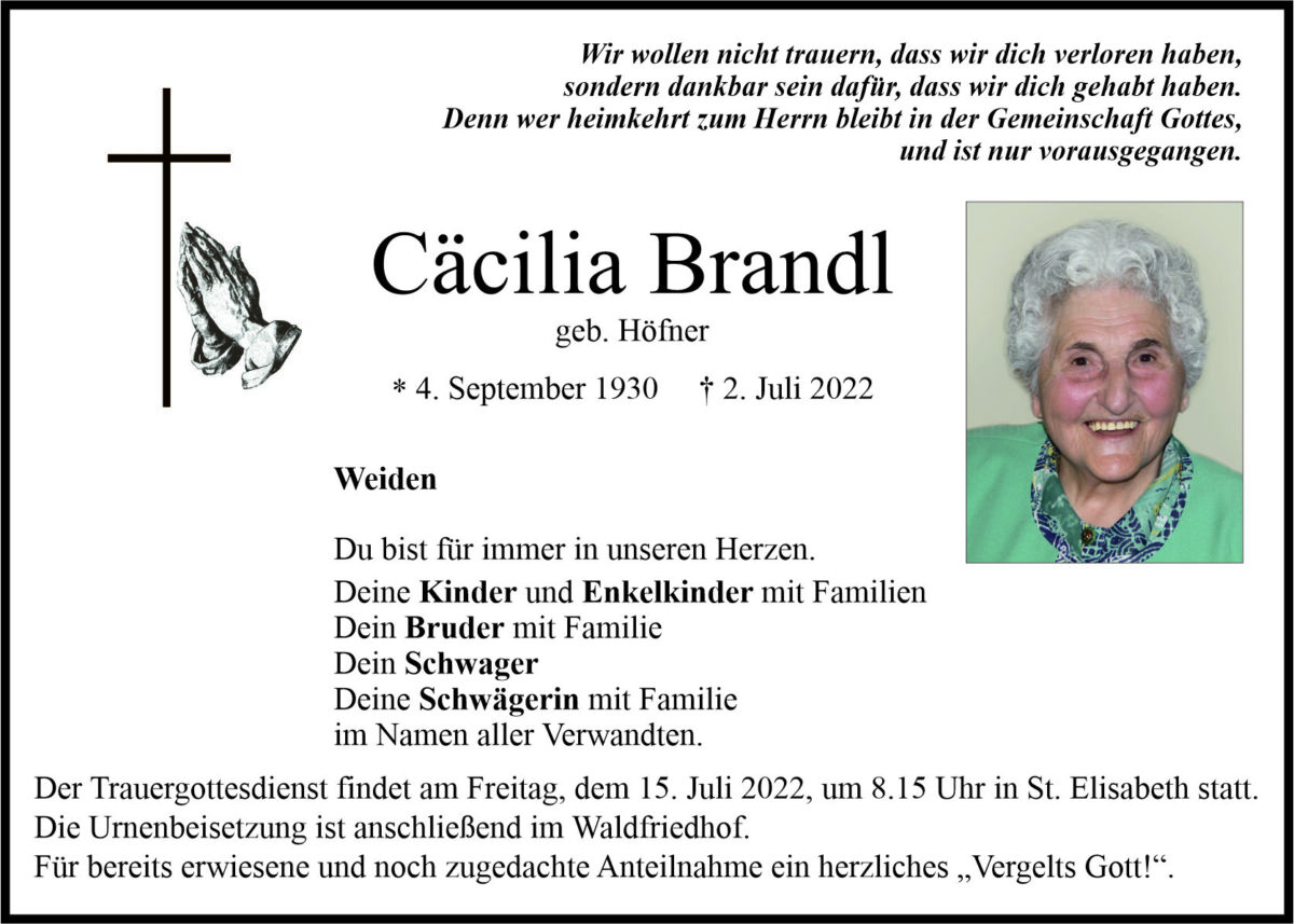 Traueranzeige Cäcilia Brandl, Weiden 11. Juli 2022, 06:00 Uhr Von: redaktion Traueranzeige Cäcilia Brandl, Weiden Stadtgebiete Weiden Weiden Stadt