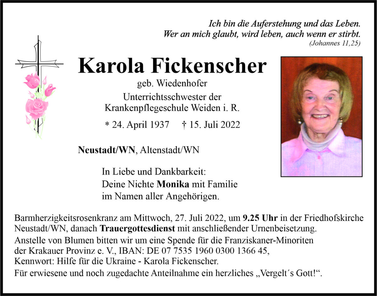 Traueranzeige Carola Fickenscher, Neustadt/WN 23. Juli 2022, 06:00 Uhr Von: redaktion Traueranzeige Carola Fickenscher, Neustadt/WN Landkreis Neustadt/WN Altenstadt/WN Neustadt/WN
