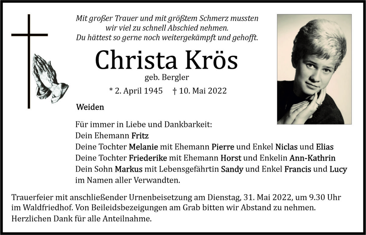 Traueranzeige Christa Krös, Weiden 25. Mai 2022, 06:00 Uhr Von: redaktion Traueranzeige Christa Krös, Weiden Stadtgebiete Weiden Weiden Stadt