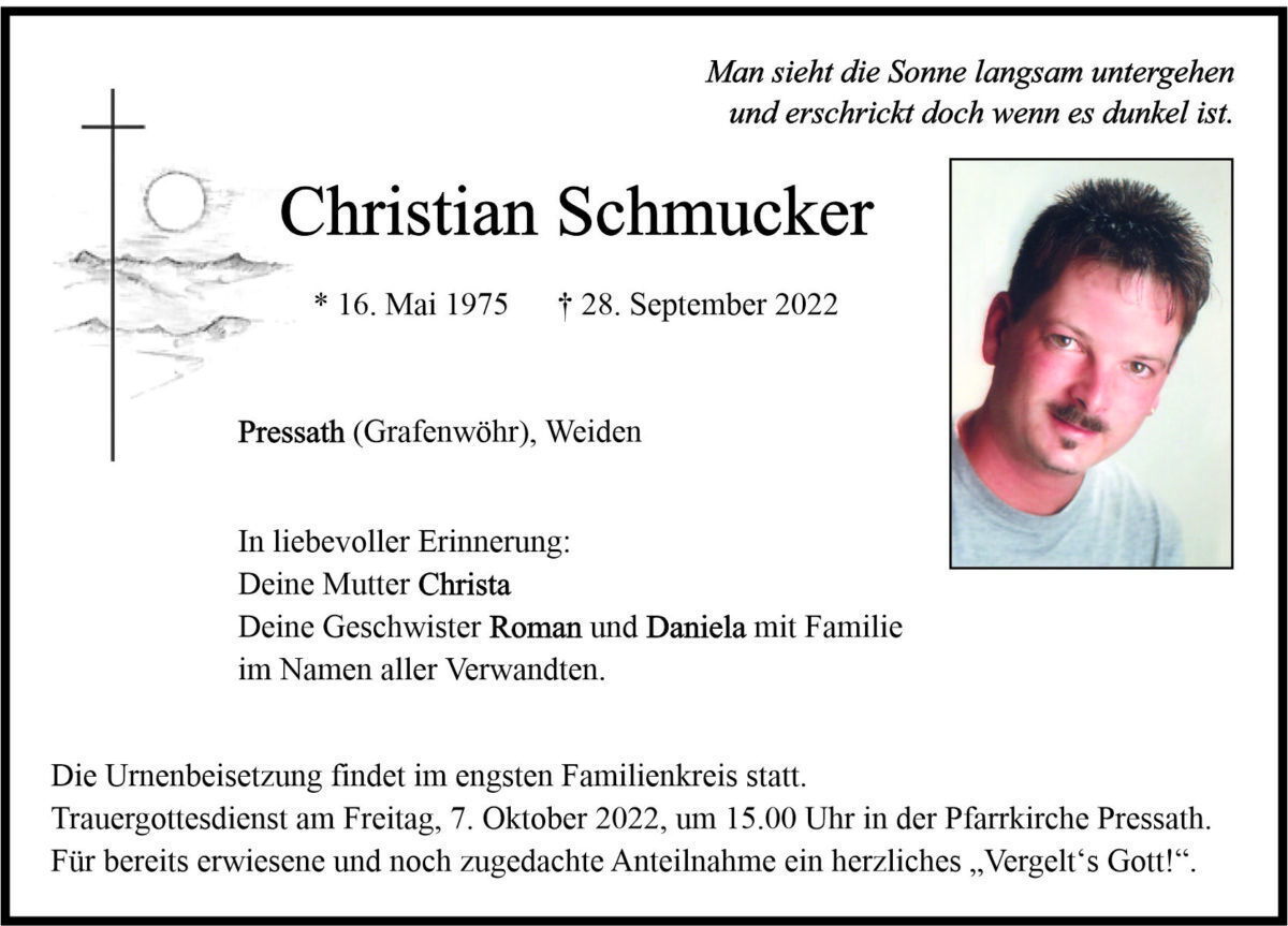 Traueranzeige Christian Schmucker, Pressath 04. Oktober 2022, 06:00 Uhr Von: redaktion Traueranzeige Christian Schmucker, Pressath Landkreis Neustadt/WN Grafenwöhr Pressath Stadtgebiete Weiden Weiden Stadt