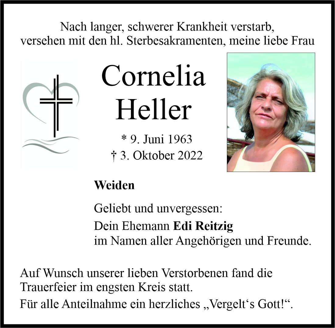 Traueranzeige Cornelia Heller, Weiden 29. Oktober 2022, 06:00 Uhr Von: redaktion Traueranzeige Cornelia Heller, Weiden Stadtgebiete Weiden Weiden Stadt