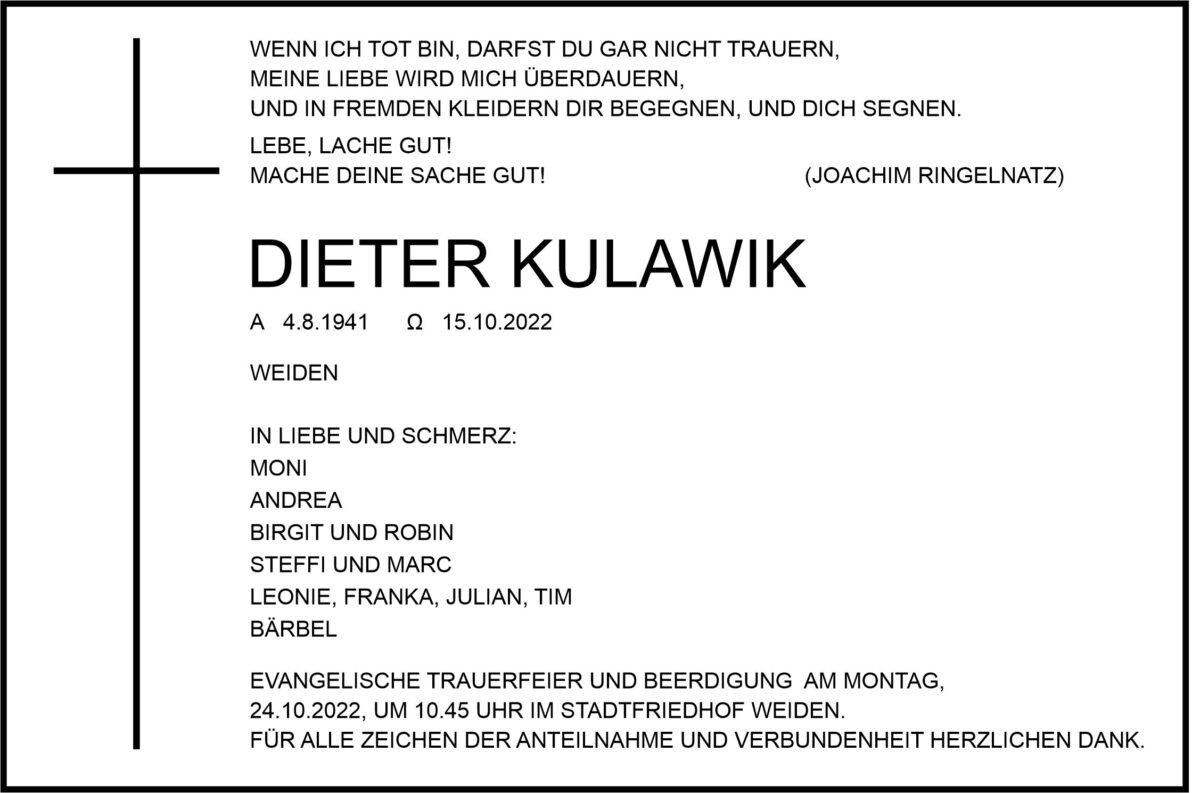 Traueranzeige Dieter Kulawik, Weiden 20. Oktober 2022, 06:00 Uhr Von: redaktion Traueranzeige Dieter Kulawik, Weiden Stadtgebiete Weiden Weiden Stadt