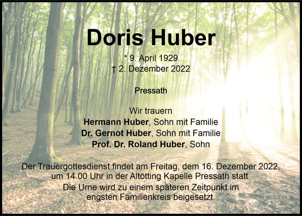 Traueranzeige Doris Huber, Pressath 14. Dezember 2022, 06:00 Uhr Von: redaktion Traueranzeige Doris Huber, Pressath Landkreis Neustadt/WN Pressath