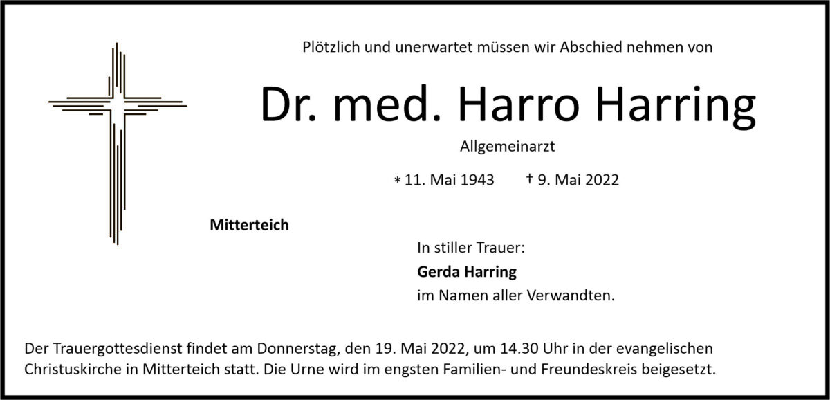 Traueranzeige Dr. med. Harro Harring, Mitterteich 17. Mai 2022, 06:00 Uhr Von: redaktion Traueranzeige Dr. med. Harro Harring, Mitterteich Landkreis Tirschenreuth Mitterteich
