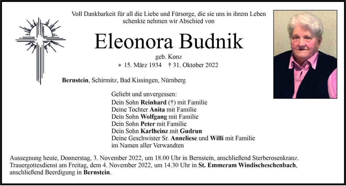 Traueranzeige Eleonora Budnik, Bernstein 03. November 2022, 06:00 Uhr Von: redaktion Traueranzeige Eleonora Budnik, Bernstein Landkreis Neustadt/WN Schirmitz Windischeschenbach