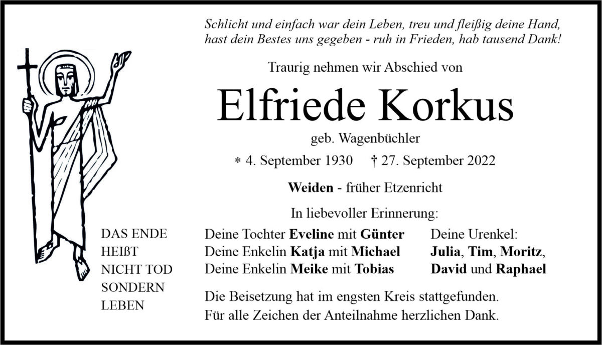Traueranzeige Elfriede Korkus, Weiden 08. Oktober 2022, 06:00 Uhr Von: redaktion Traueranzeige Elfriede Korkus, Weiden Landkreis Neustadt/WN Etzenricht Stadtgebiete Weiden Weiden Stadt