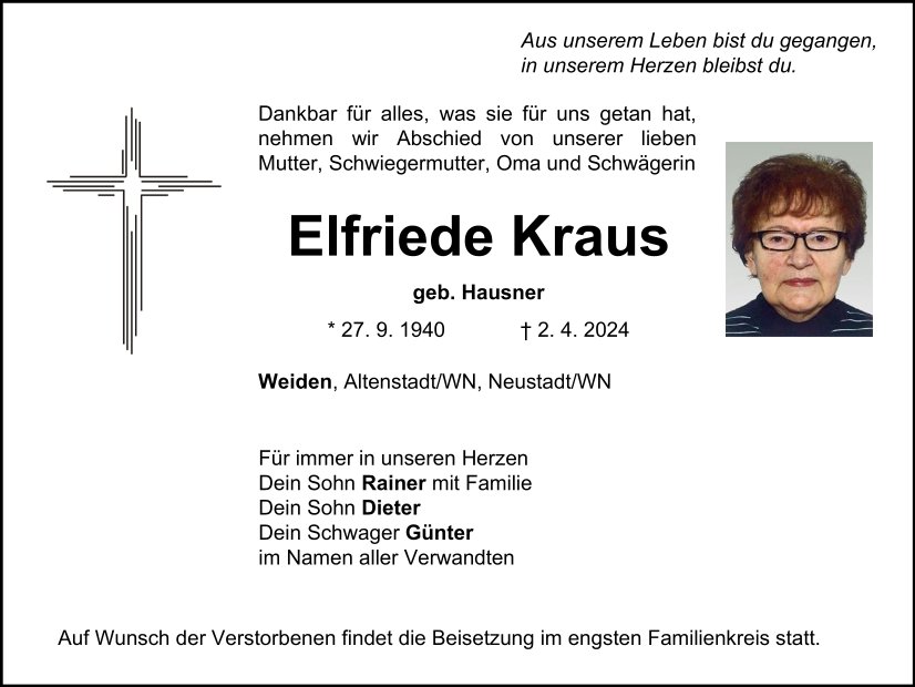 Traueranzeige Elfriede Kraus, Weiden 03. Mai 2024, 20:00 Uhr Von: redaktion Begleitet durch: Bestattung Schmid - Neustadt/WN Traueranzeige Elfriede Kraus, Weiden Landkreis Neustadt/WN Altenstadt/WN Neustadt/WN Stadtgebiete Weiden Weiden Stadt
