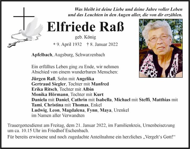 Traueranzeige Elfriede Raß, Apfelbach 17. Januar 2022, 05:00 Uhr Von: redaktion Traueranzeige Elfriede Raß, Apfelbach Landkreis Neustadt/WN Eschenbach