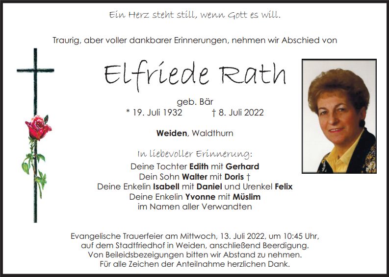Traueranzeige Elfriede Rath, Weiden 12. Juli 2022, 06:00 Uhr Von: redaktion Traueranzeige Elfriede Rath, Weiden Landkreis Neustadt/WN Waldthurn Stadtgebiete Weiden Weiden Stadt