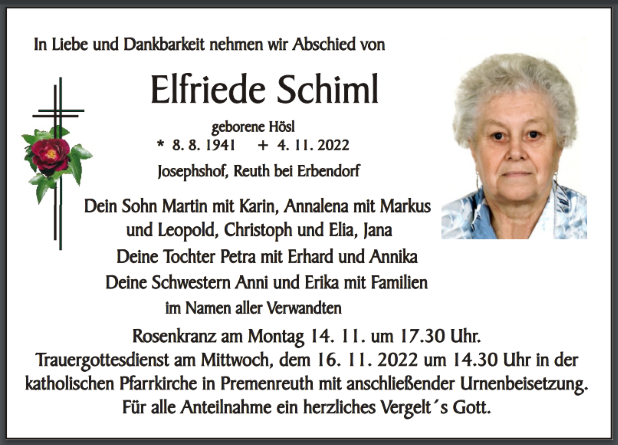 Traueranzeige Elfriede Schiml, Josephshof 12. November 2022, 06:00 Uhr Von: redaktion Traueranzeige Elfriede Schiml, Josephshof Landkreis Tirschenreuth Reuth b. Erbendorf