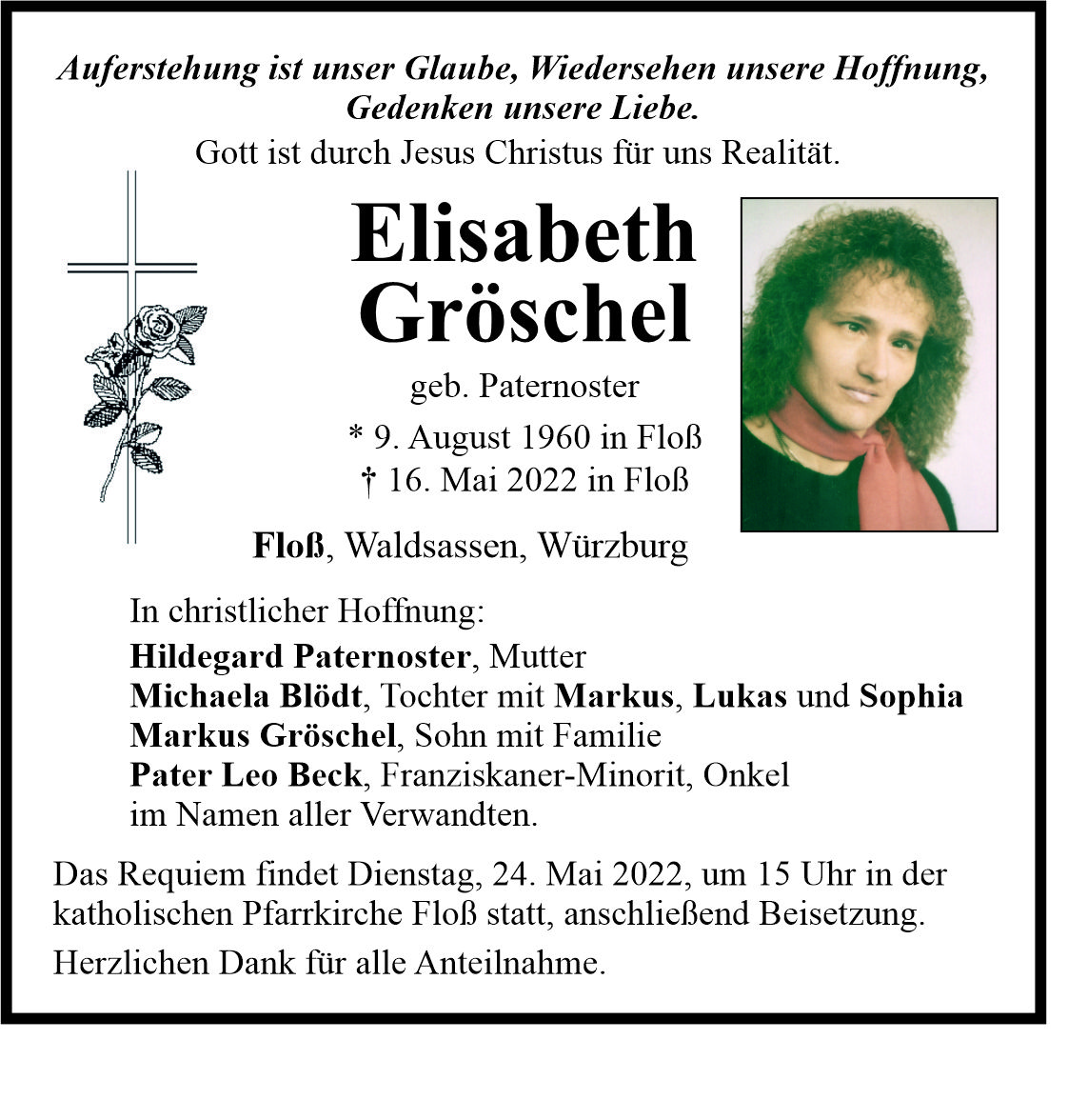 Traueranzeige Elisabeth Gröschel, Floß 21. Mai 2022, 06:00 Uhr Von: redaktion Traueranzeige Elisabeth Gröschel, Floß Landkreis Neustadt/WN Floß Landkreis Tirschenreuth Waldsassen