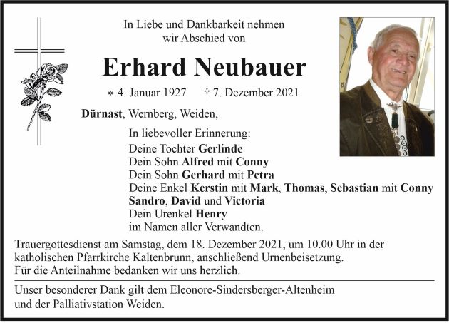 Traueranzeige Erhard Neubauer, Dürnast 15. Dezember 2021, 06:30 Uhr Von: redaktion Traueranzeige Erhard Neubauer, Dürnast Landkreis Neustadt/WN Weiherhammer