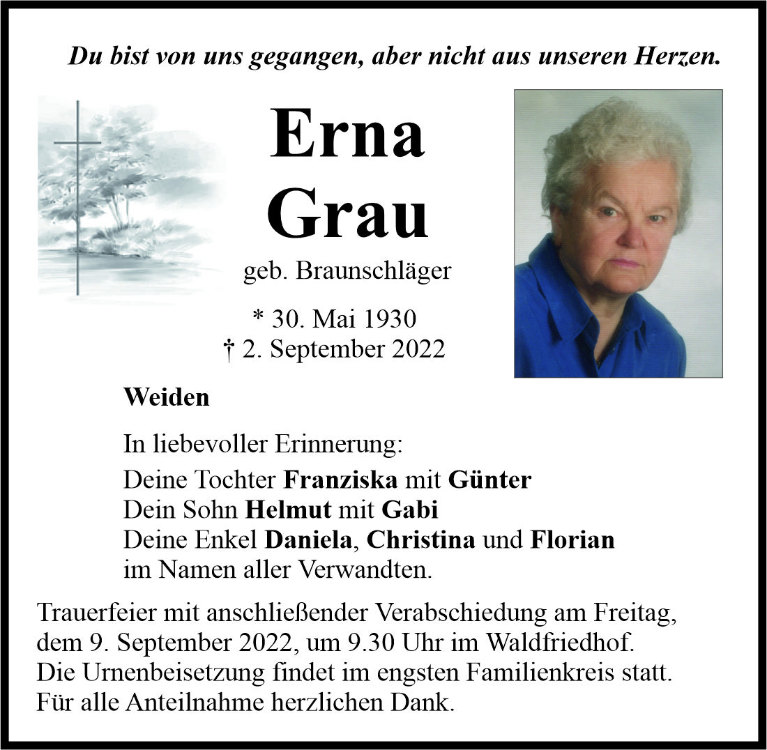 Traueranzeige Erna Grau, Weiden 07. September 2022, 06:00 Uhr Von: redaktion Traueranzeige Erna Grau, Weiden Stadtgebiete Weiden Weiden Stadt