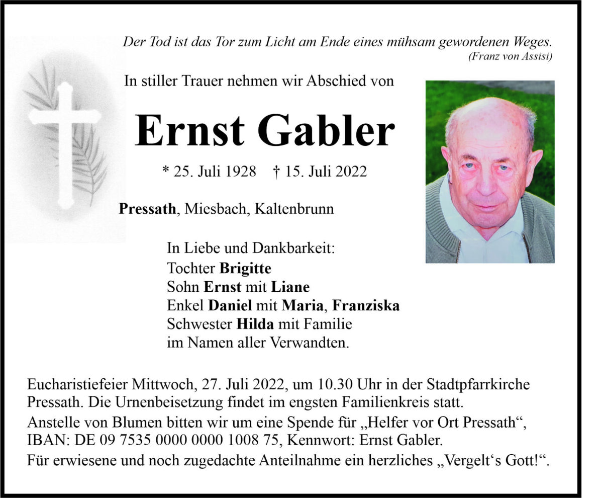 Traueranzeige Ernst Gabler, Pressath 23. Juli 2022, 06:00 Uhr Von: redaktion Traueranzeige Ernst Gabler, Pressath Landkreis Neustadt/WN Kaltenbrunn Pressath