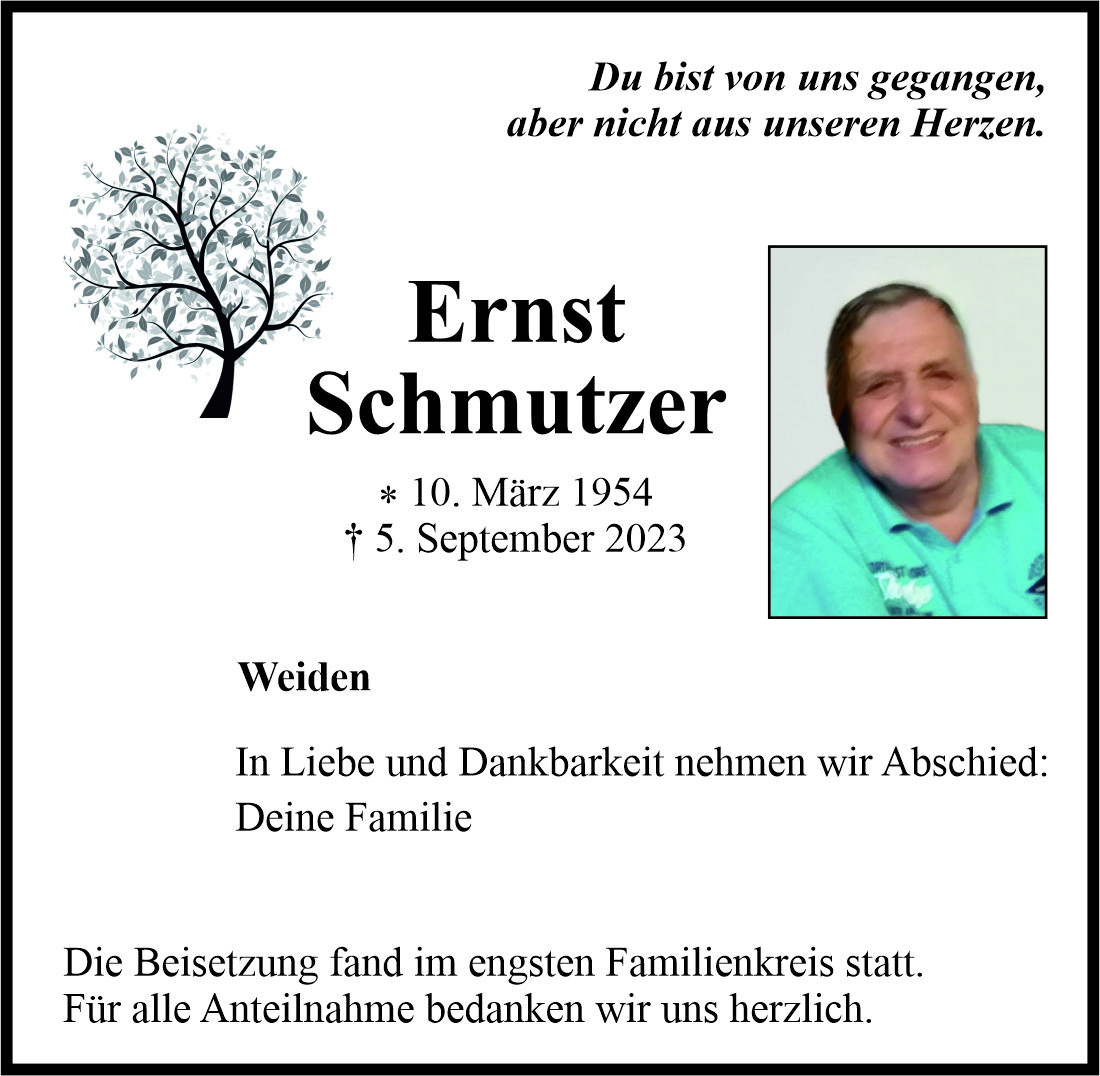Traueranzeige Ernst Schmutzer, Weiden 22. September 2023, 20:00 Uhr Von: redaktion Traueranzeige Ernst Schmutzer, Weiden Stadtgebiete Weiden Weiden Stadt