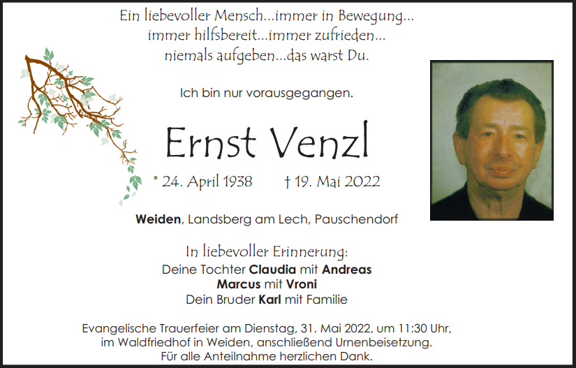 Traueranzeige Ernst Venzl, Weiden 28. Mai 2022, 06:00 Uhr Von: redaktion Traueranzeige Ernst Venzl, Weiden Stadtgebiete Weiden Weiden Stadt