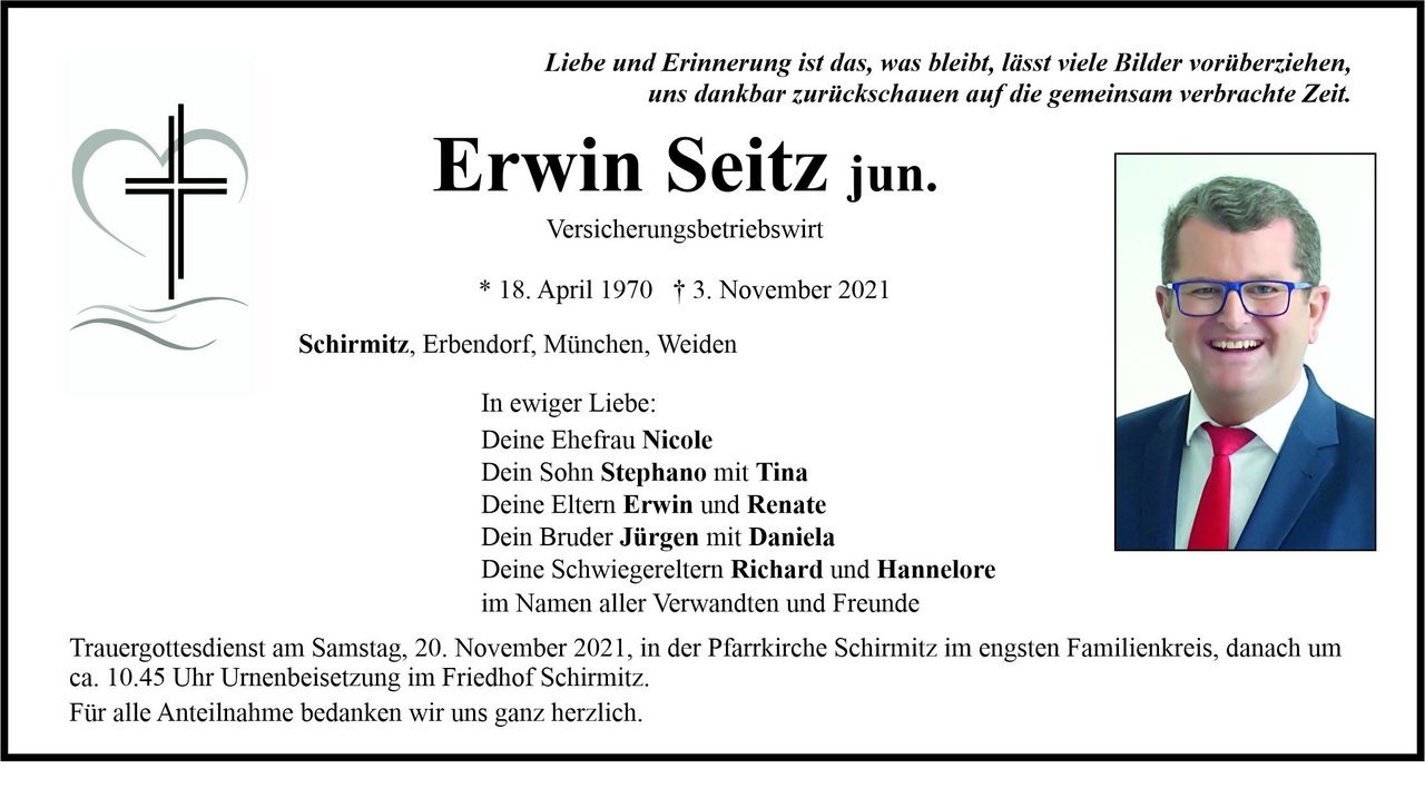 Traueranzeige Erwin Seitz jun., Schirmitz 17. November 2021, 05:00 Uhr Von: redaktion Traueranzeige Erwin Seitz jun., Schirmitz Landkreis Neustadt/WN Schirmitz