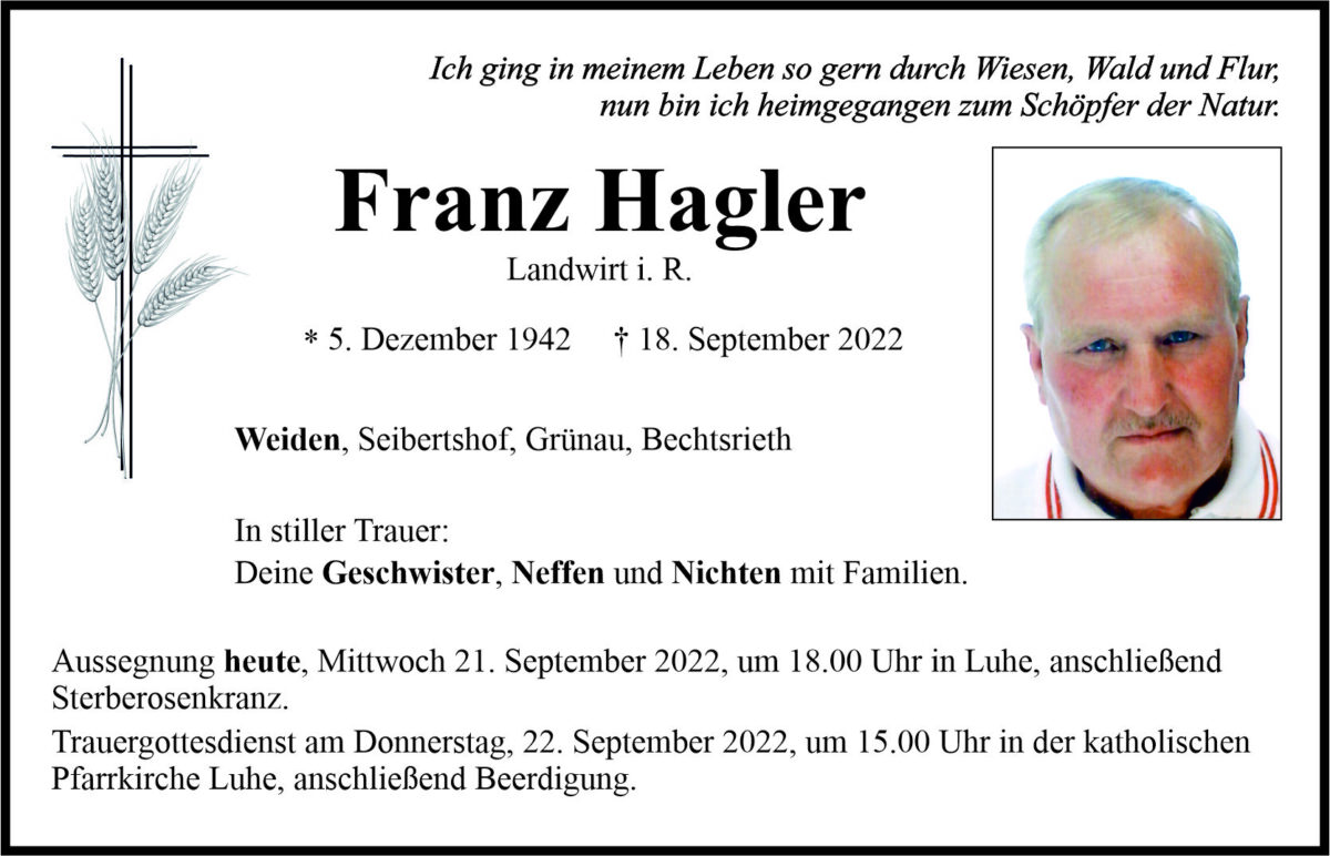 Traueranzeige Franz Hagler, Weiden 21. September 2022, 06:00 Uhr Von: redaktion Traueranzeige Franz Hagler, Weiden Landkreis Neustadt/WN Bechtsrieth Stadtgebiete Weiden Weiden Stadt