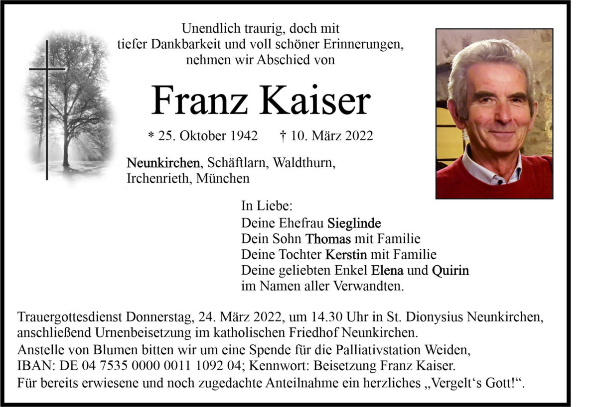 Traueranzeige Franz Kaiser, Neunkirchen 19. März 2022, 06:00 Uhr Von: redaktion Traueranzeige Franz Kaiser, Neunkirchen Landkreis Neustadt/WN Irchenrieth Waldthurn Stadtgebiete Weiden Neunkirchen