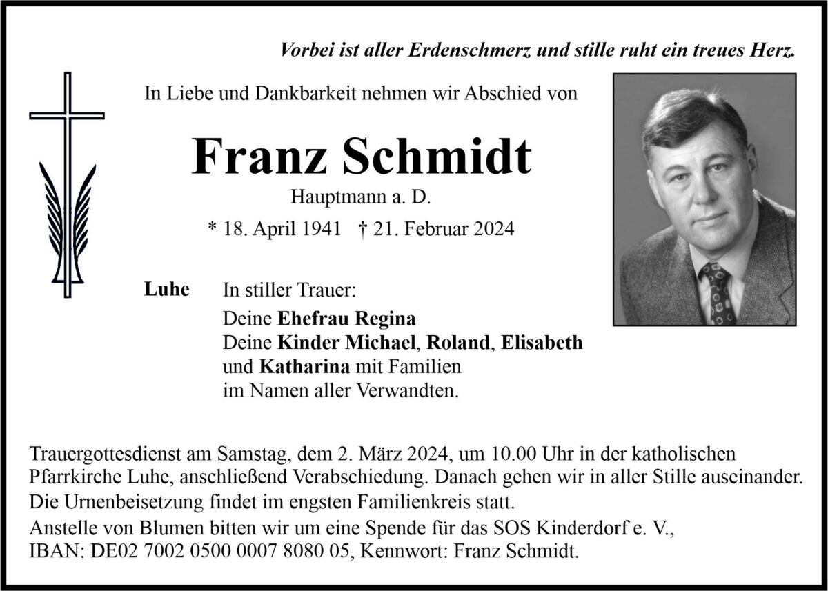 Traueranzeige Franz Schmidt, Luhe 23. Februar 2024, 20:00 Uhr Von: redaktion Traueranzeige Franz Schmidt, Luhe Landkreis Neustadt/WN Luhe-Wildenau