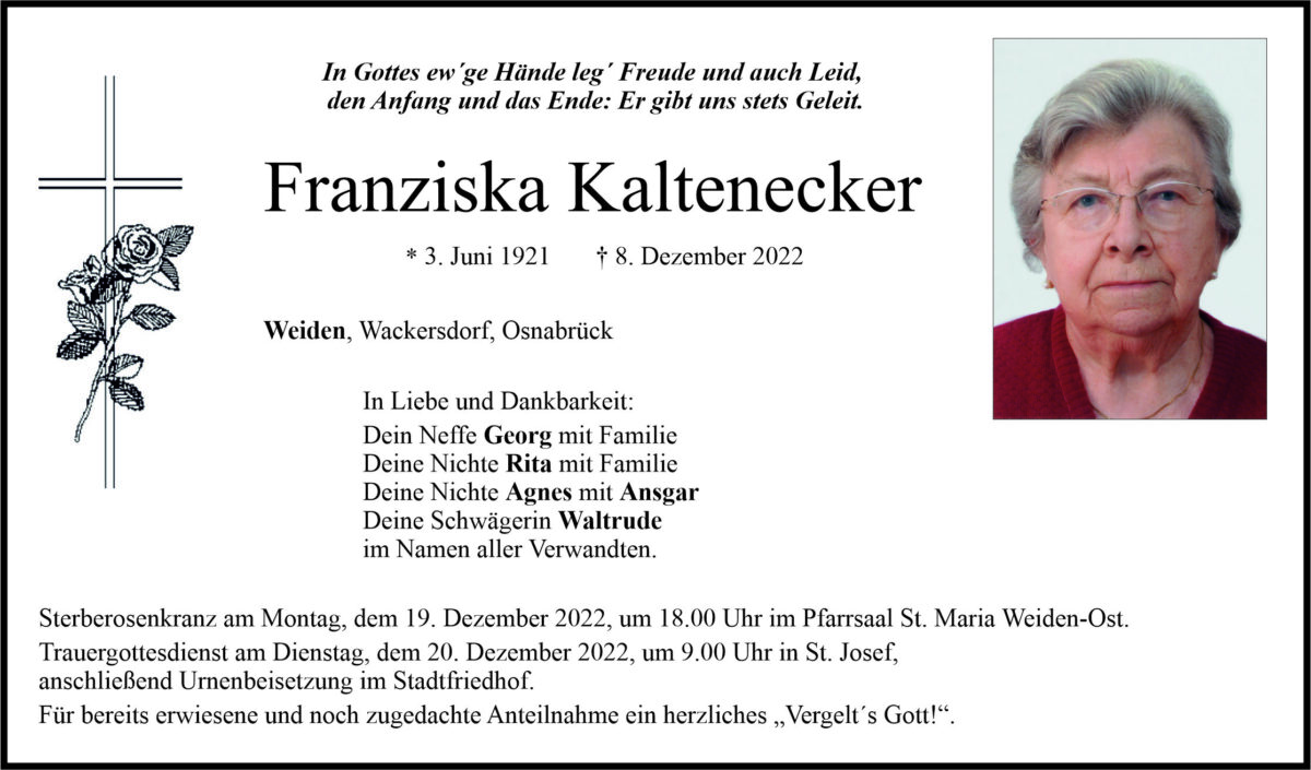 Traueranzeige Franziska Kaltenecker, Weiden 17. Dezember 2022, 06:00 Uhr Von: redaktion Traueranzeige Franziska Kaltenecker, Weiden Stadtgebiete Weiden Weiden Stadt